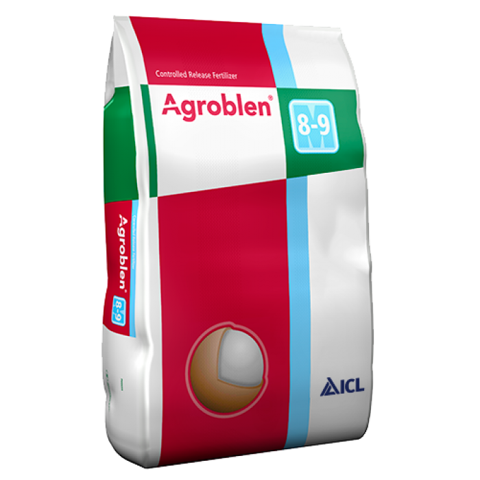 Agroblen 8-9M (17-9-8+4MgO) je plně obalované NPK hnojivo s řízeným uvolňováním živin určené pro středně a dlouhodobé plodiny. Obsahuje dostatek živin, které rostlině vystačí na celý 8-9 měsíční pěstební cyklus. Stálá dodávka živin zajistí dokonale vyrovnaný růst.