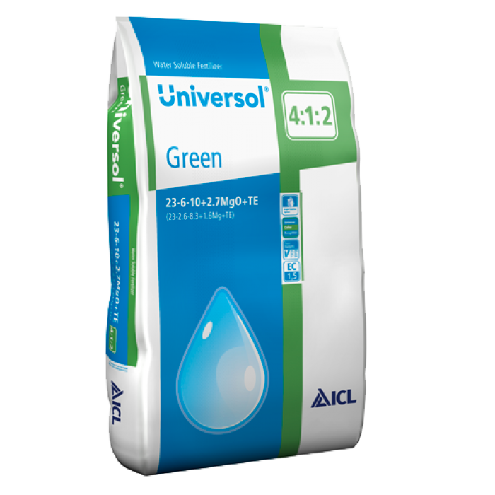 Universol Green 23-6-10+2.7MgO+TE lze použít tehdy, je-li hlavním cílem růst – poměr N:K je 2:1 ve prospěch dusíku. Produkt obsahuje NPK, hořčík a kompletní řadu stopových prvků.