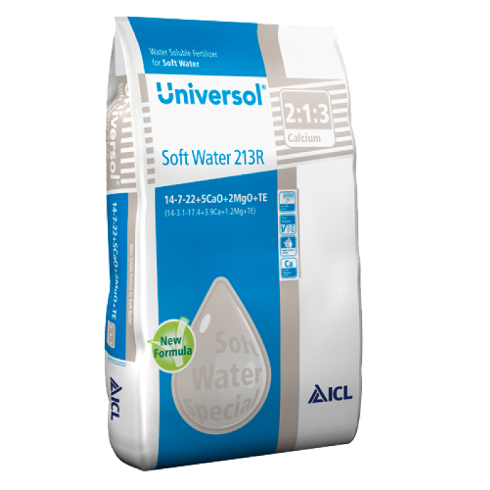 Universol Soft Water 213R 14-7-22+5CaO+2MgO+TE je určený k použití v podmínkách s měkkou závlahovou vodou s nízkým obsahem hydrogenuhličitanů. Tento produkt obsahuje NPK, Mg, Ca a kompletní řadu stopových prvků. S poměrem N:K (2:3) je Universol Soft Water 213R ideálni pro listovou výživu a ranné fáze pěstebního cyklu.