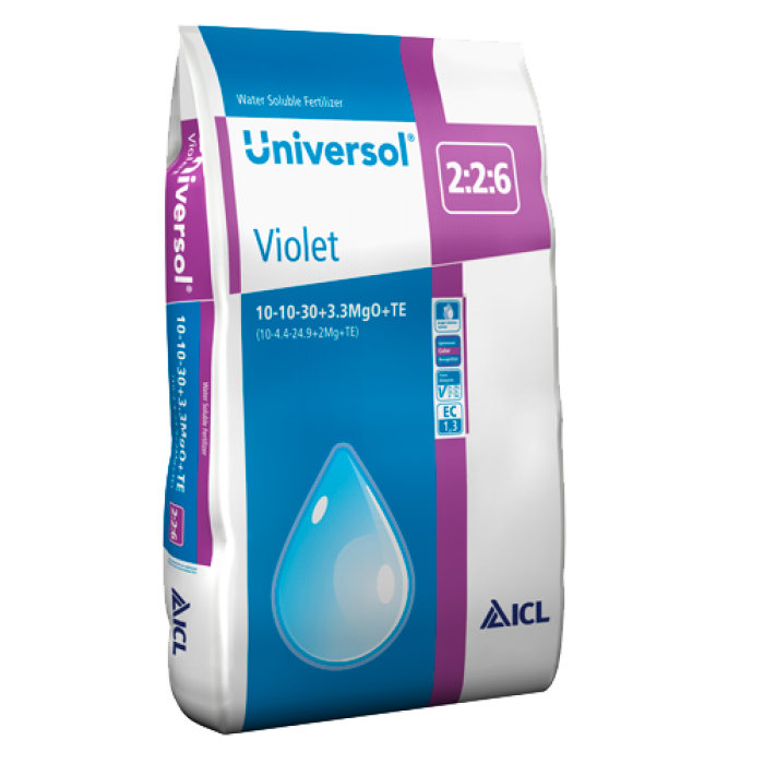 Universol Violet 10-10-30+3.3MgO+TE má vysoký obsah draslíku, který zajišťuje silný kompaktní růst, sytou barvu listů a správný vývoj květů. Produkt obsahuje NPK, Mg a kompletní řadu stopových prvků.