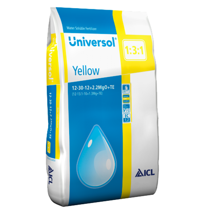 Universol Yellow 12-30-12+2.2MgO+TE dodává velké množství fosforu. Nejčastěji se používá na začátku pěstebního cyklu hned po přesazení k podpoře tvorby kořenů u mladých rostlin. Tento produkt je také doporučován pro podporu tvorby květů. Produkt obsahuje NPK, Mg a kompletní řadu stopových prvků.